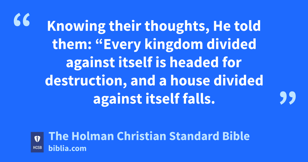 17 Knowing their thoughts, b He told them: “Every kingdom divided c against itself is headed for destruction, and a house divided against itself falls. 18 If Satan d also is divided against himself, how will his kingdom e stand? For you say I drive out demons by Beelzebul. 19 And if I drive out demons by Beelzebul, who is it your sons f g drive them out by? For this reason they will be your judges. 20 If I drive out demons by the finger of God, h then the kingdom of God i has come to you. 21 When a strong man, fully armed, guards his estate, his possessions are secure. j 22 But when one stronger than he attacks and overpowers k him, he takes from him all his weapons l m he trusted n in, and divides up his plunder. o 23 Anyone who is not with Me is against Me, p and anyone who does not gather with Me scatters.