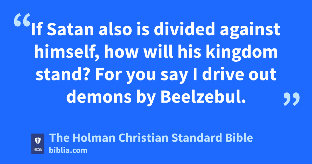17 Knowing their thoughts, b He told them: “Every kingdom divided c against itself is headed for destruction, and a house divided against itself falls. 18 If Satan d also is divided against himself, how will his kingdom e stand? For you say I drive out demons by Beelzebul. 19 And if I drive out demons by Beelzebul, who is it your sons f g drive them out by? For this reason they will be your judges. 20 If I drive out demons by the finger of God, h then the kingdom of God i has come to you. 21 When a strong man, fully armed, guards his estate, his possessions are secure. j 22 But when one stronger than he attacks and overpowers k him, he takes from him all his weapons l m he trusted n in, and divides up his plunder. o 23 Anyone who is not with Me is against Me, p and anyone who does not gather with Me scatters.
