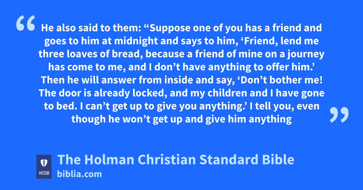 5 He also said to them: “Suppose one of you c has a friend and goes to him at midnight and says to him, ‘Friend, lend me three loaves of bread, 6 because a friend of mine on a journey has come to me, and I don’t have anything to offer him.’ d 7 Then he will answer from inside and say, ‘Don’t bother me! The door is already locked, and my children and I have gone to bed. I can’t get up to give you anything.’ 8 I tell you, even though he won’t get up and give him anything because he is his friend, yet because of his friend’s persistence, e he will get up and give him as much as he needs. f