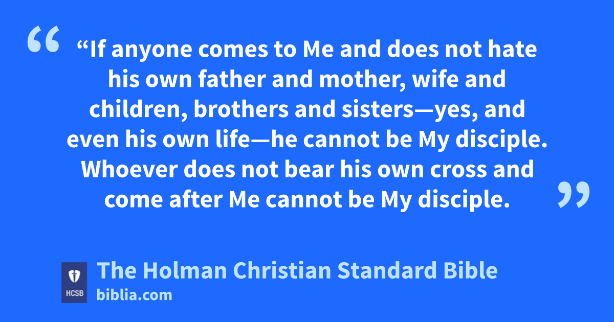 25 Now z great crowds were traveling with Him. So He turned and said to them: 26 “If anyone comes to Me a and does not hate b his own father and mother, wife and children, brothers and sisters—yes, and even his own life—he cannot be My disciple. 27 Whoever does not bear his own cross c and come after Me cannot be My disciple.