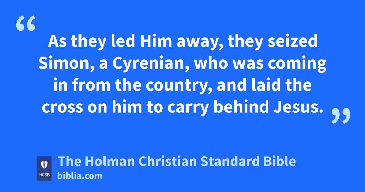 26 As y they led Him away, they seized Simon, a Cyrenian, z who was coming in from the country, and laid the cross a on him to carry behind Jesus. 27 A large crowd of people followed Him, including women who were mourning and lamenting Him. b 28 But turning to them, Jesus said, “Daughters of Jerusalem, c do not weep for Me, but weep for yourselves and your children. 29 Look, the days are coming d when they will say, ‘The women without children, the wombs that never bore and the breasts that never nursed, are fortunate!’ e 30 Then they will begin to say to the mountains, ‘Fall on us!’ and to the hills, ‘Cover us!’ f g 31 For if they do these things when the wood is green, what will happen when it is dry?” h