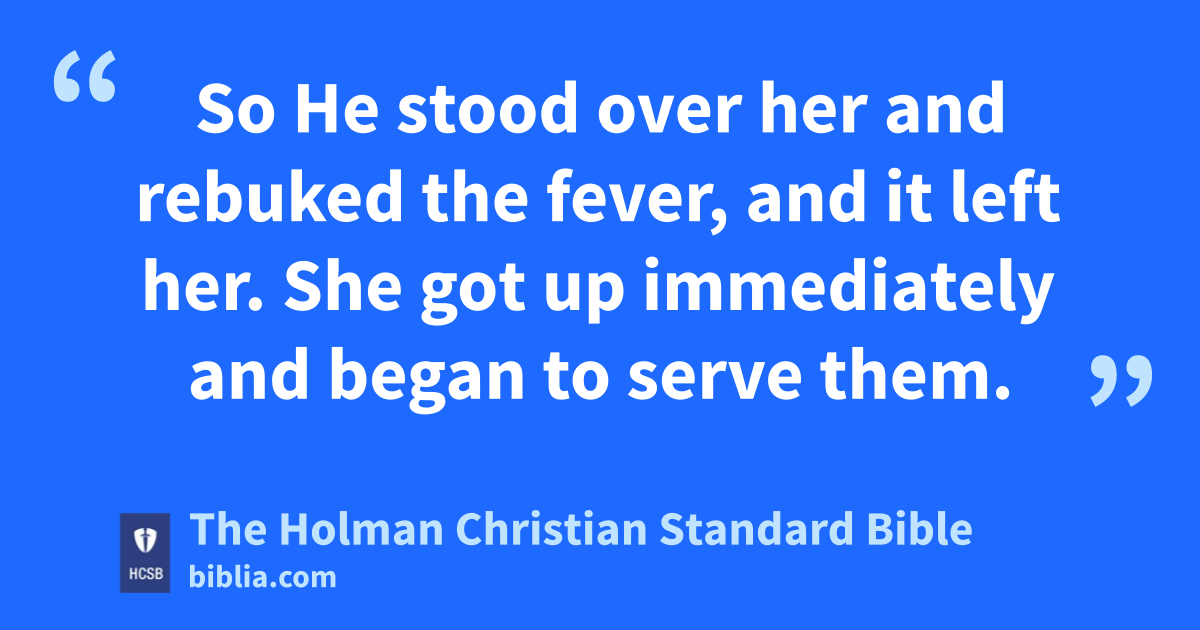 38 After He left the synagogue, He entered Simon’s house. e Simon’s mother-in-law was suffering from a high fever, and they asked Him about her. f 39 So He stood over her and rebuked the fever, and it left her. She got up immediately g and began to serve them.