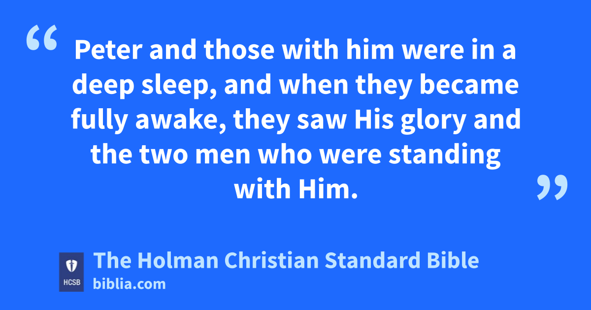 32 Peter and those with him were in a deep sleep, t u and when they became fully awake, they saw His glory and the two men who were standing with Him. 33 As the two men were departing from Him, Peter said to Jesus, “Master, v it’s good for us to be here! Let us make three * tabernacles: one for You, one for Moses, and one for Elijah”—not knowing what he said. w