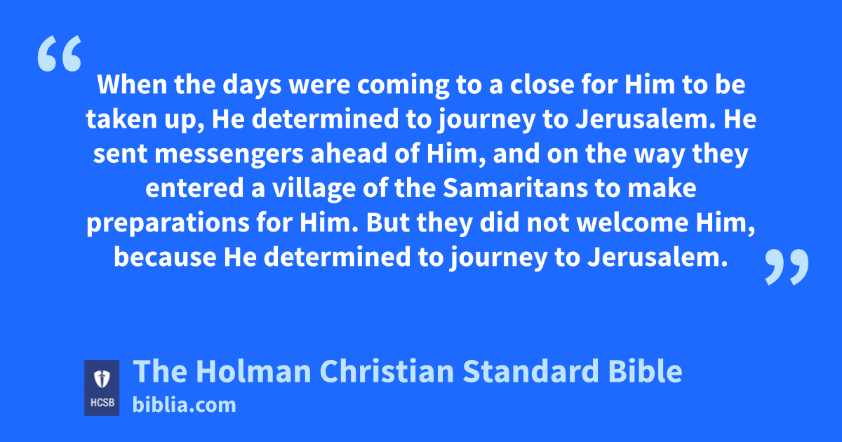 51 When the days were coming to a close for Him to be taken up, e f He determined g h to journey to Jerusalem. i 52 He sent messengers ahead of Him, j and on the way they entered a village of the * Samaritans k to make preparations for Him. 53 But they did not welcome Him, because He determined to journey to Jerusalem. l 54 When the disciples James and John saw this, they said, “Lord, do You want us to call down fire from heaven to consume them?” m n