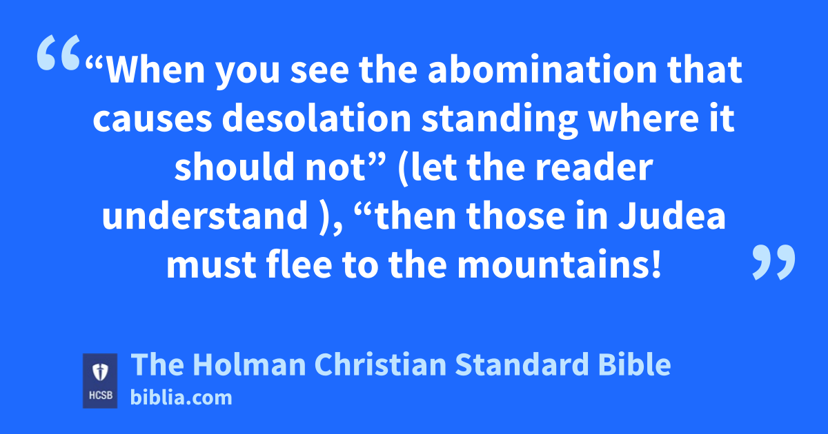 14 “When you see the abomination that causes desolation d e standing where it should not” (let the reader understand f), “then those in Judea g must flee to the mountains! 15 A man on the housetop must not come down or go in to get anything out of his house. h 16 And a man in the field must not go back to get his clothes. i 17 Woe j to pregnant women and nursing mothers in those days! 18 Pray k it l won’t happen in winter. 19 For those will be days of tribulation, m the kind that hasn’t been from the beginning n of the world, o p which God created, until now and never will be again! 20 Unless the Lord q limited those days, r no one would survive. s But He limited those days because of the elect, t whom He chose. u