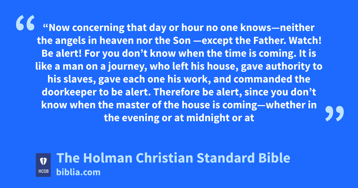 32 “Now concerning that day t or hour no one knows—neither the angels u in heaven nor the Son v—except the Father. w 33 Watch! Be alert! x For you don’t know when the time y is coming. z 34 It is like a a man on a journey, who left his house, gave authority to his * slaves, b gave each one his work, and commanded the doorkeeper to be alert. 35 Therefore be alert, c since you don’t know when the master d of the house is coming—whether in the evening or at midnight or at the crowing of the rooster or early in the morning. 36 Otherwise, he might come suddenly and find you sleeping. e 37 And what I say to you, I say to everyone: Be alert!”
