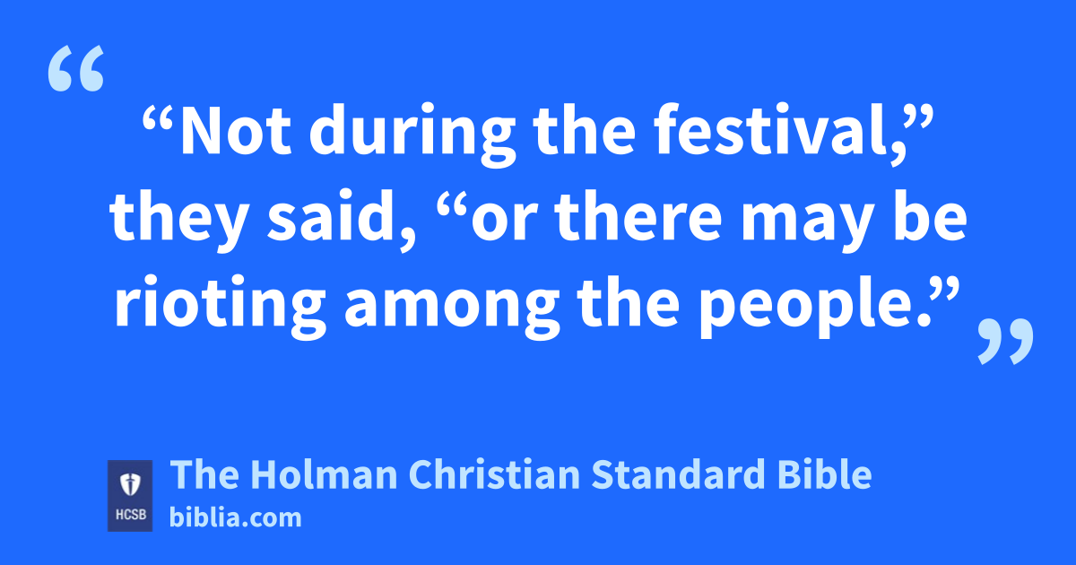 14 After f two days it was the * Passover g and the Festival h of * Unleavened Bread. i The * chief priests and the * scribes j were looking for a treacherous k way to arrest and kill Him. l 2 “Not during the festival,” they said, “or there may be rioting among the people.”
