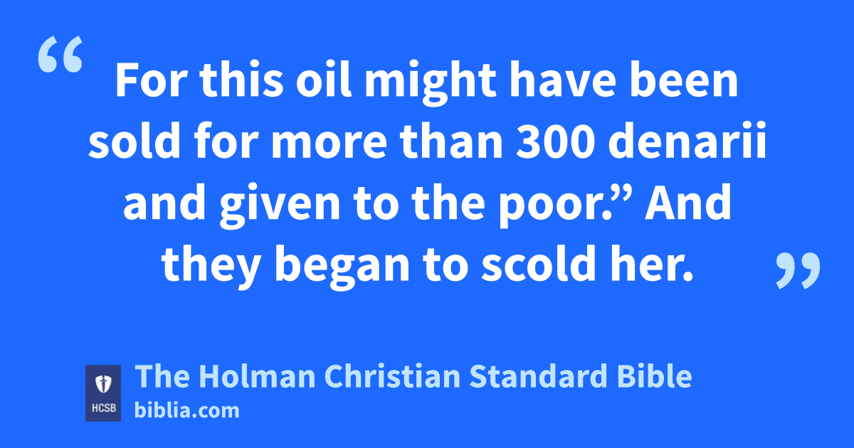 3 While m He was in Bethany n at the house of Simon who had a serious skin disease, o as He was reclining at the table, p a woman came with an alabaster jar of pure and expensive fragrant oil of nard. She broke the jar and poured it on His head. q 4 But some were expressing indignation to one another: “Why has this fragrant oil been wasted? 5 For this oil might have been sold for more than 300 * denarii r and given to the poor.” s And they began to scold her.