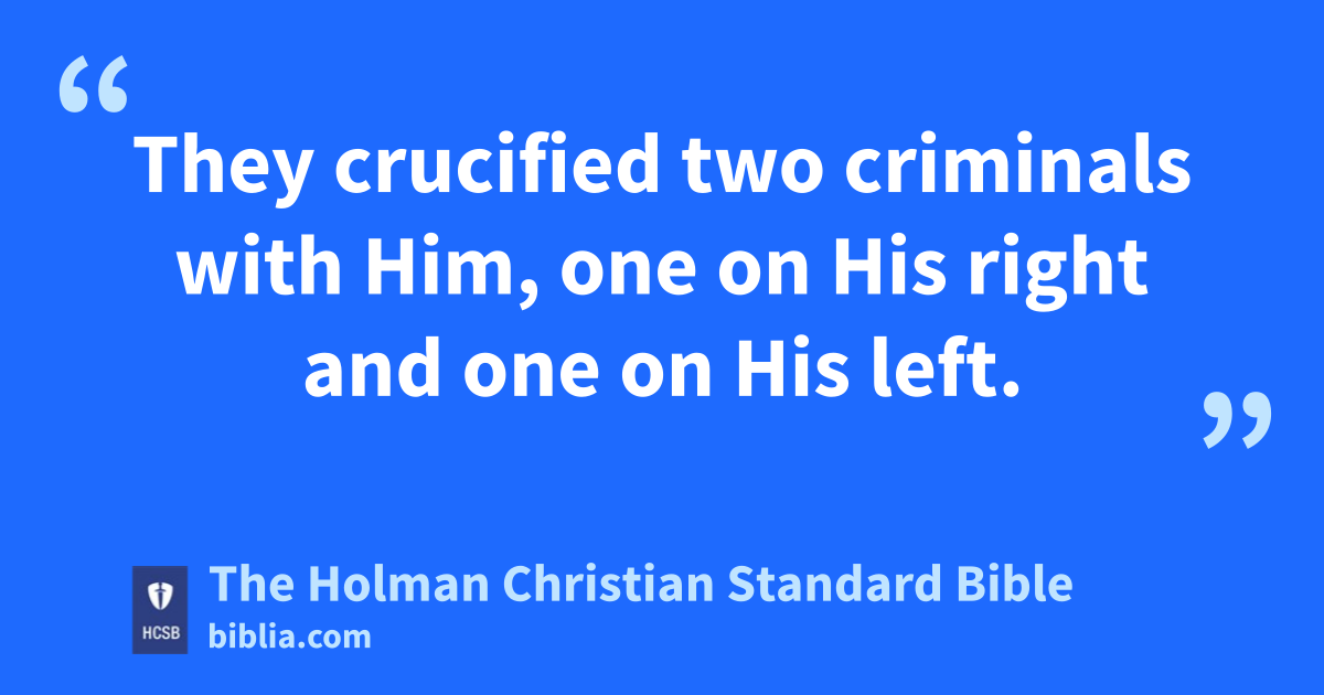 27 They k crucified two criminals l m with Him, one on His right and one on His left. [28 So the Scripture was fulfilled that says: And He was counted among outlaws.] n o p 29 Those q who passed by were yelling insults r at s Him, shaking their heads, t and saying, “Ha! The One who would demolish the sanctuary and build it in three days, u 30 save Yourself by coming down from the cross!” v 31 In the same way, the chief priests with the scribes w were mocking Him to one another and saying, “He saved others; He cannot save Himself! 32 Let the * Messiah, x the King y of Israel, z come down now from the cross, a so that we may see and believe.” b Even those who were crucified with Him were taunting Him.
