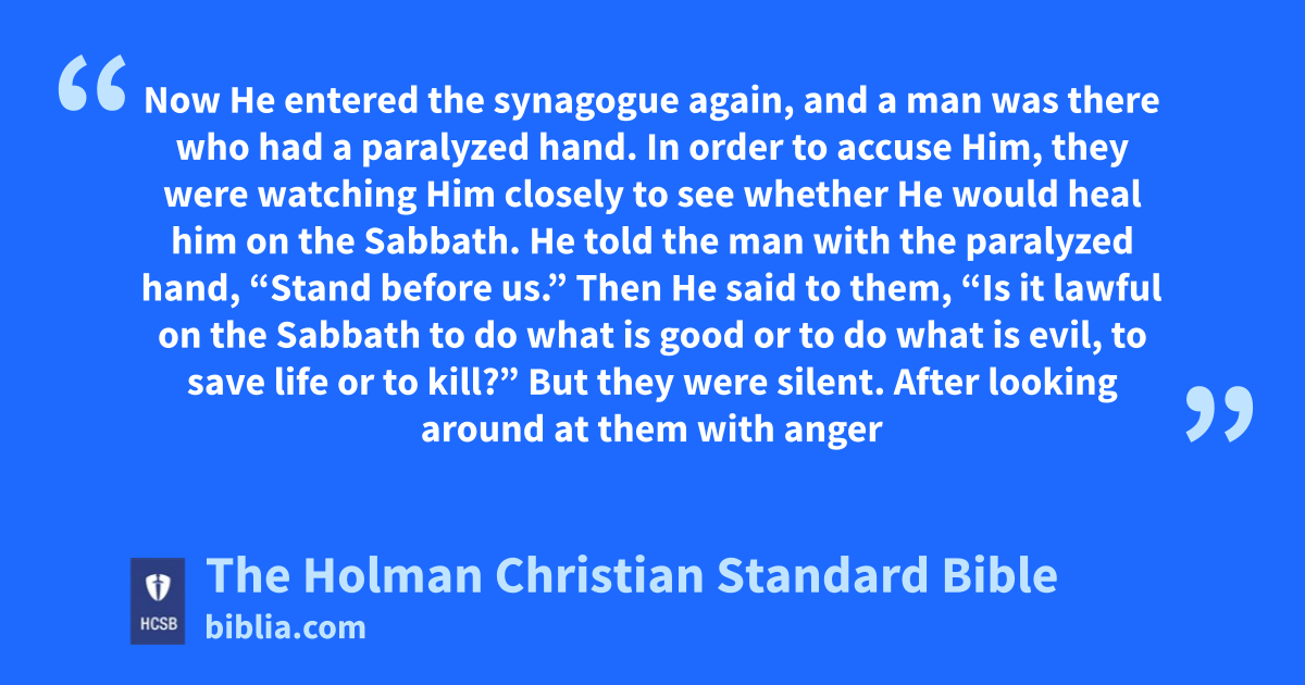 3 Now f He entered the * synagogue g again, and a man was there who had a paralyzed h hand. 2 In order to accuse i Him, they were watching Him closely j to see whether He would heal k him on the Sabbath. l 3 He told the man with the paralyzed hand, “Stand before us.” m 4 Then He said to them, “Is it lawful n on the Sabbath to do what is good o or to do what is evil, p to save life q or to kill?” r But they were silent. s 5 After looking around at them with anger t and sorrow at the hardness u of their hearts, He told the man, “Stretch out your hand.” So he stretched it out, and his hand was restored. v 6 Immediately the * Pharisees w went out and started plotting x with the * Herodians y against Him, how they might destroy z Him.