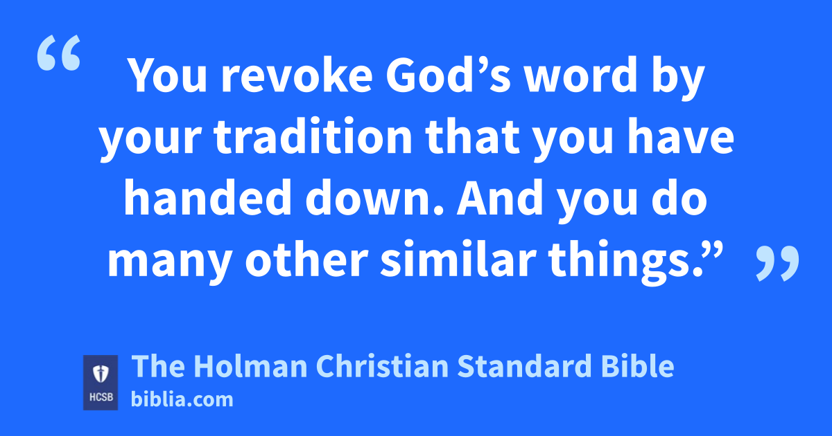 11 But you say, ‘If a man tells his father or mother: Whatever benefit o you might have received from me is Corban’ ” (that is, a gift p committed to the temple), 12 “you no longer let him do anything for his father or mother. 13 You revoke God’s word q by your tradition that you have handed r down. And you do many other similar things.” 14 Summoning s the crowd again, He told them, “Listen to Me, all of you, and understand: t 15 Nothing that goes into a person from outside can defile him, but the things that come out of a person are what defile him. [16 If anyone has ears to hear, he should listen!]” u