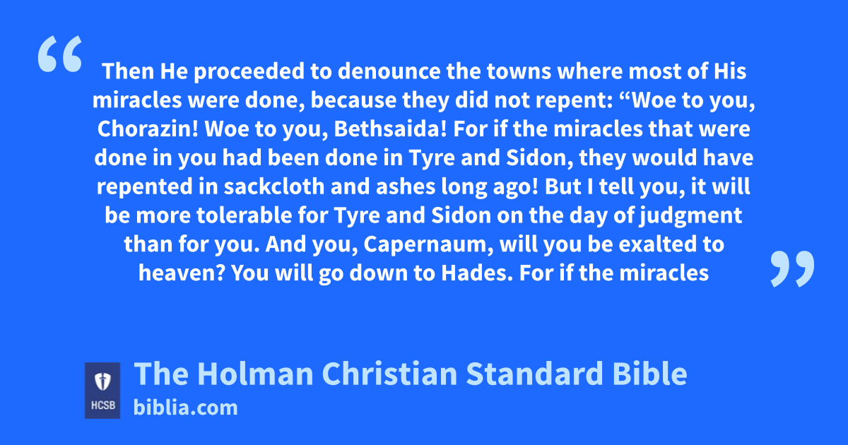 20 Then He proceeded to denounce the towns where most of His miracles were done, because they did not repent: 21 “Woe to you, Chorazin! i Woe to you, Bethsaida! j For if the miracles that were done in you had been done in Tyre and Sidon, k they would have repented in * sackcloth and ashes long ago! 22 But I tell you, it will be more tolerable for Tyre and Sidon on the day of judgment l than for you. 23 And you, Capernaum, will you be exalted to heaven? You will go down to * Hades. m For if the miracles that were done in you had been done in Sodom, it would have remained until today. 24 But I tell you, it will be more tolerable for the land of Sodom on the day of judgment than for you.”