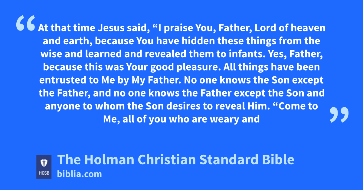 25 At that time Jesus said, n “I praise o You, Father, Lord of heaven and earth, because You have hidden these things from the wise and learned and revealed them to infants. p 26 Yes, Father, because this was Your good pleasure. q 27 All things have been entrusted to Me by My Father. No one knows r the Son except the Father, and no one knows the Father except the Son and anyone to whom the Son desires s to reveal Him. t