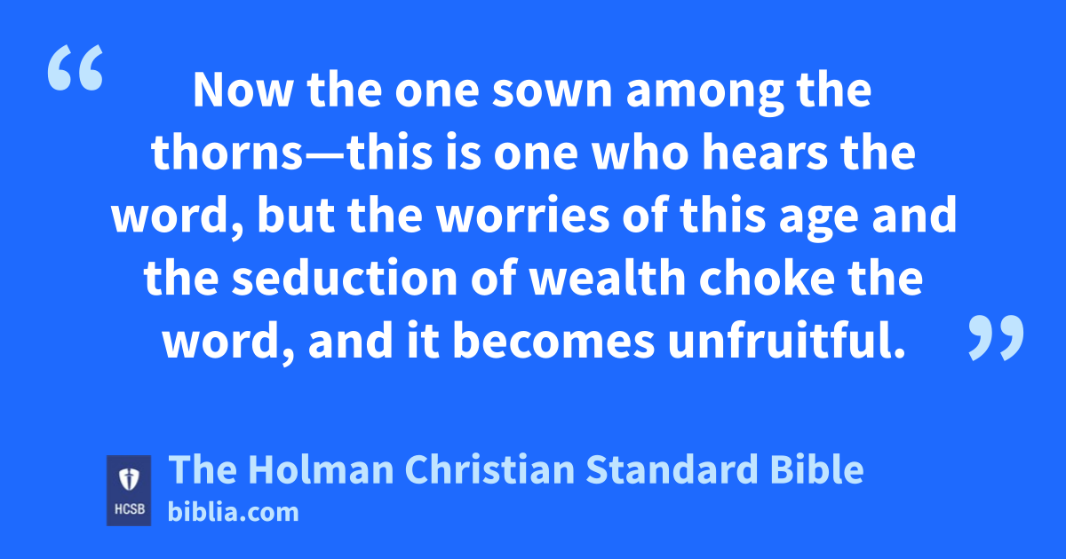 18 “You, then, listen to the parable of the sower: b 19 When anyone hears the word c about the kingdom and doesn’t understand it, the evil one comes and snatches away what was sown in his heart. This is the one sown along the path. d 20 And the one sown on rocky ground—this is one who hears the word and immediately receives it with joy. e 21 Yet he has no root in himself, but is short-lived. When pressure or persecution f comes because of the word, immediately he stumbles. 22 Now the one sown among the thorns—this is one who hears the word, but the worries of this age g and the seduction h of wealth i choke the word, and it becomes unfruitful. 23 But the one sown on the good ground—this is one who hears and understands the word, who does bear fruit and yields: some 100, some 60, some 30 times what was sown.”