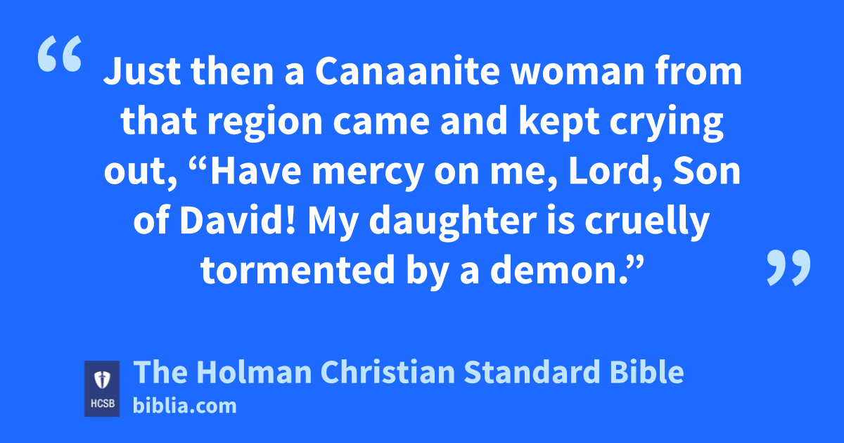 21 When Jesus left there, e He withdrew to the area of Tyre and Sidon. f 22 Just then a Canaanite woman from that region came and kept crying out, g “Have mercy on me, Lord, Son of David! My daughter is cruelly tormented by a demon.” h