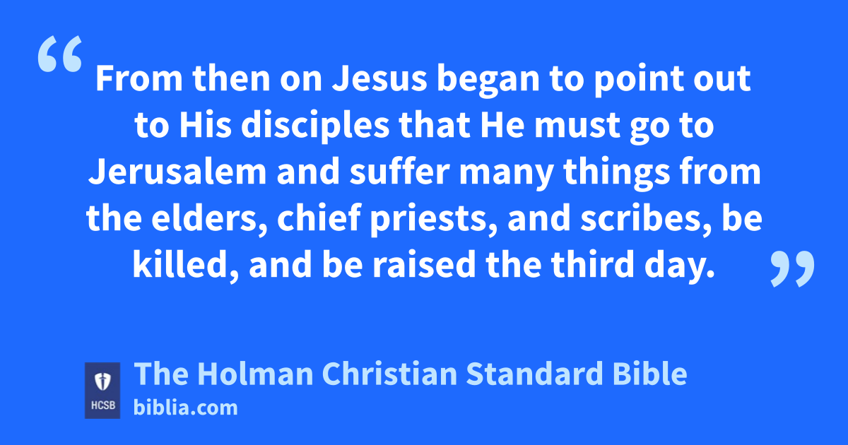 21 From a then on Jesus began to point out to His disciples that He must go to Jerusalem and suffer many things from the elders, * chief priests, and * scribes, be killed, and be raised the third day. b 22 Then Peter took Him aside and began to rebuke Him, “Oh no, c Lord! This will never happen to You!”