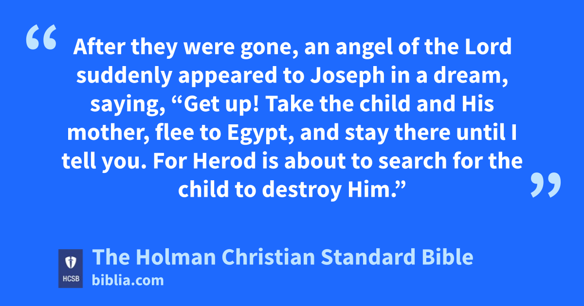 13 After they were gone, an angel of the Lord suddenly appeared to Joseph in a dream, saying, “Get up! Take the child and His mother, flee to Egypt, and stay there until I tell you. For Herod is about to search for the child to destroy Him.” w 14 So he got up, took the child and His mother during the night, and escaped to Egypt. 15 He stayed there until Herod’s death, so that what was spoken by the Lord through the prophet might be fulfilled: Out of Egypt I called My Son. x y
