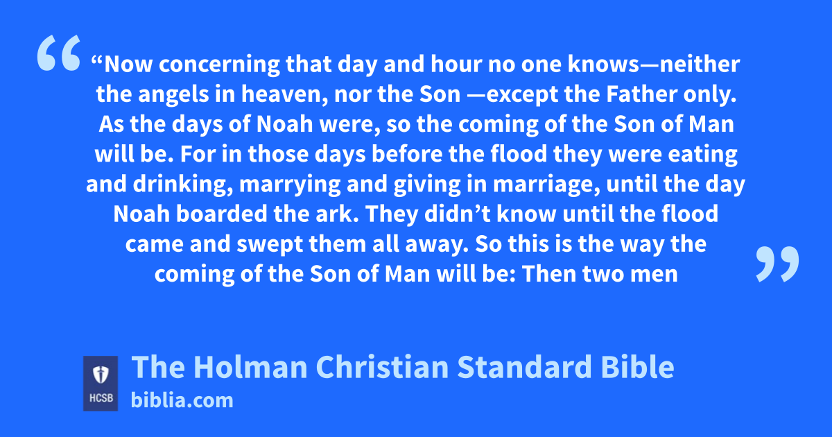 36 “Now concerning that day and hour no one knows—neither the angels in heaven, nor the Son n—except the Father only. o 37 As the days of Noah were, so the coming of the Son of Man will be. 38 For in those days before the flood they were eating and drinking, marrying and giving in marriage, until the day Noah boarded the ark. p 39 They didn’t know q until the flood came and swept them all away. So this is the way the coming of the Son of Man will be: 40 Then two men will be in the field: one will be taken and one left. 41 Two women will be grinding at the mill: one will be taken and one left. r 42 Therefore be alert, since you don’t know what day s your Lord is coming. t 43 But know this: If the homeowner had known what time u the thief was coming, he would have stayed alert and not let his house be broken into. v 44 This is why you also must be ready, because the Son of Man is coming at an hour you do not expect. w