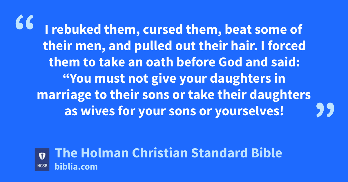 23 In those days I also saw Jews who had married women from Ashdod, Ammon, and Moab. k 24 Half of their children spoke the language of Ashdod or the language of one of the other peoples but could not speak Hebrew. l m 25 I rebuked them, cursed them, beat some of their men, and pulled out their hair. n I forced them to take an oath o before God and said: “You must not give your daughters in marriage to their sons or take their daughters as wives for your sons or yourselves! p 26 Didn’t King Solomon of Israel sin in matters like this? There was not a king like him among many nations. He was loved by his God and God made him king over all Israel, yet foreign women drew him into sin. q 27 Why then should we hear about you doing all this terrible evil and acting unfaithfully against our God by marrying foreign women?” r