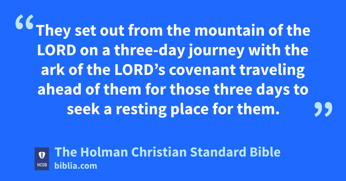 33 They set out from the mountain of the Lord on a three-day journey with the ark of the Lord’s covenant traveling ahead of them for those three days to seek a resting place for them. s 34 Meanwhile, the cloud of the Lord was over them by day when they set out from the camp.