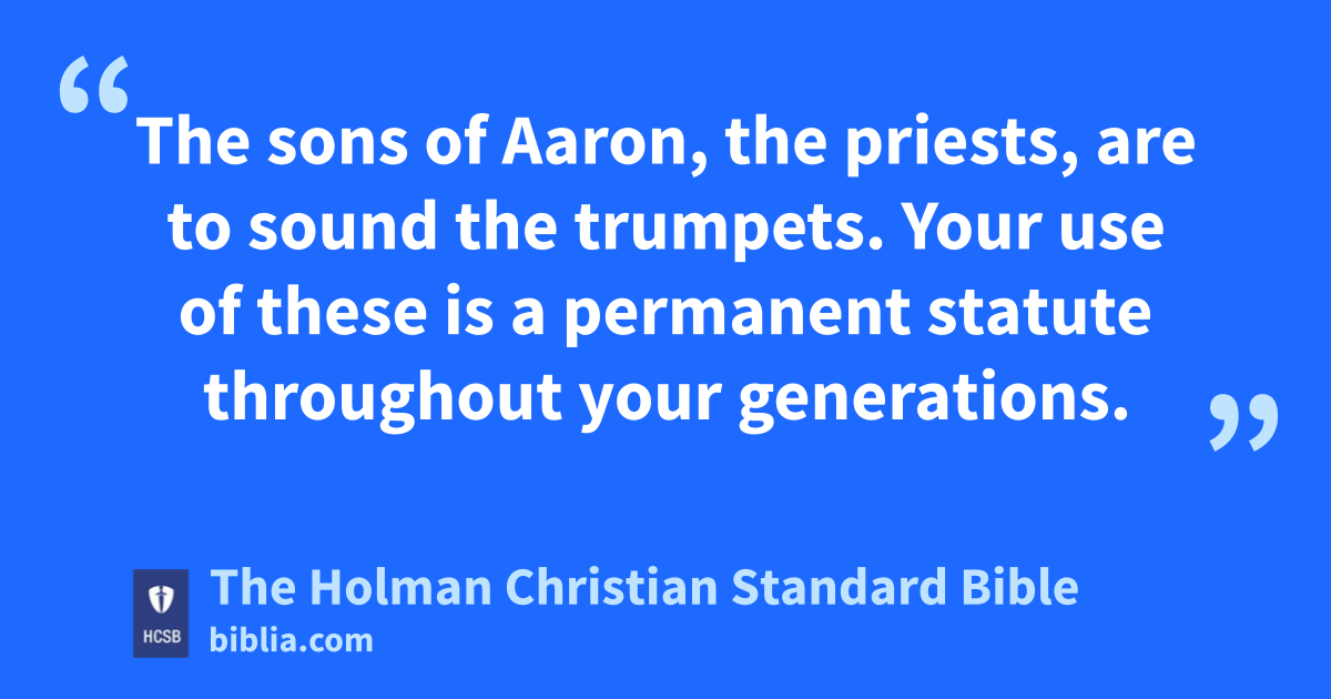 5 “When you sound short blasts, the camps pitched on the east z are to set out. 6 When you sound short blasts a second time, the camps pitched on the south a are to set out. Short blasts are to be sounded for them to set out. 7 When calling the assembly together, you are to sound long blasts, not short ones. 8 The sons of Aaron, the priests, are to sound the trumpets. Your use of these is a permanent statute throughout your generations.