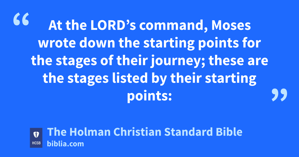 33 These were the stages of the Israelites’ journey when they went out of the land of Egypt by their military divisions under the leadership of Moses and Aaron. 2 At the Lord’s command, Moses wrote down the starting points for the stages of their journey; these are the stages listed by their starting points: