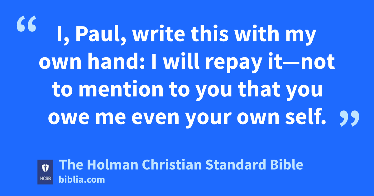 17 So if you consider me a partner, accept a him as you would me. 18 And if he has wronged you in any way, or owes you anything, charge that to my account. b 19 I, Paul, write this with my own hand: c I will repay it—not to mention to you that you owe me even your own self. 20 Yes, brother, may I have joy from you in the Lord; refresh my heart in Christ. 21 Since I am confident of your obedience, I am writing to you, knowing that you will do even more than I say. 22 But meanwhile, also prepare a guest room for me, for I hope that through your prayers I will be restored to you.