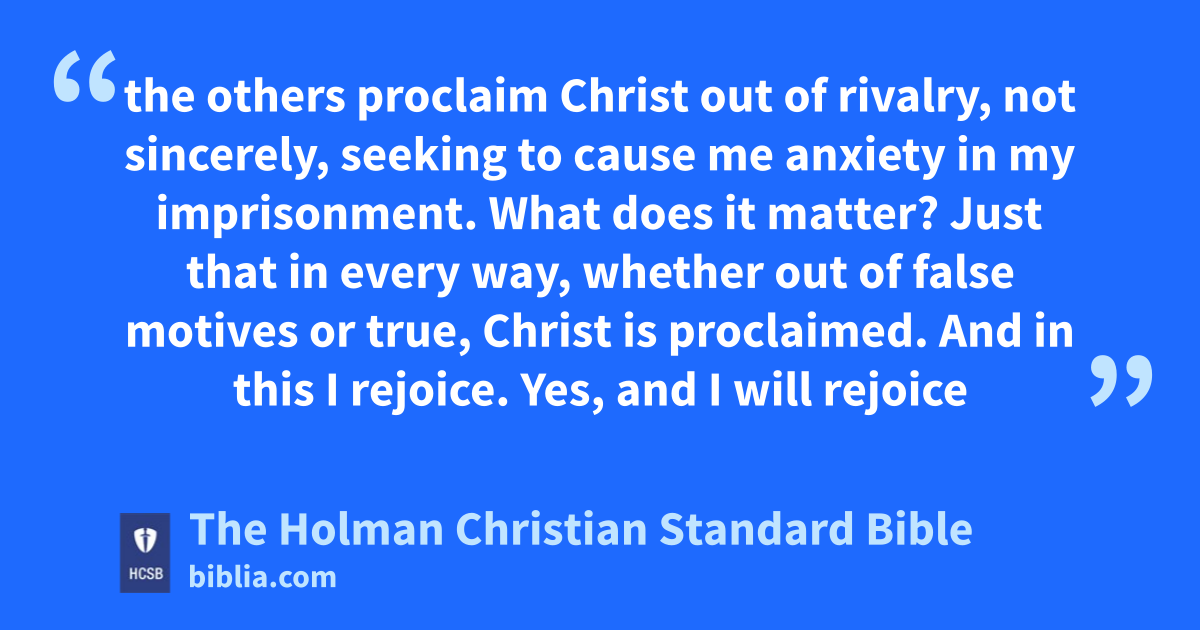 12 Now I want you to know, * brothers, that what has happened to me has actually resulted in the advance of the gospel, c 13 so that it has become known throughout the whole imperial guard, d and to everyone else, that my imprisonment is in the cause of Christ. 14 Most of the brothers in the Lord have gained confidence from my imprisonment and dare even more to speak the message e f fearlessly. 15 To be sure, some preach Christ out of envy and strife, g but others out of good will. h 16 These do so out of love, i knowing that I am appointed for the defense of the gospel; 17 the others proclaim Christ out of rivalry, j not sincerely, seeking to cause me anxiety in my imprisonment. k 18 What does it matter? Just that in every way, whether out of false motives l or true, Christ is proclaimed. And in this I rejoice. Yes, and I will rejoice 19 because I know this will lead to my deliverance m n through your prayers and help from the Spirit o of Jesus Christ. p 20 My eager expectation and hope q is that I will not be ashamed about anything, but that now as always, with all boldness, Christ will be highly honored in my body, whether by life r or by death. s