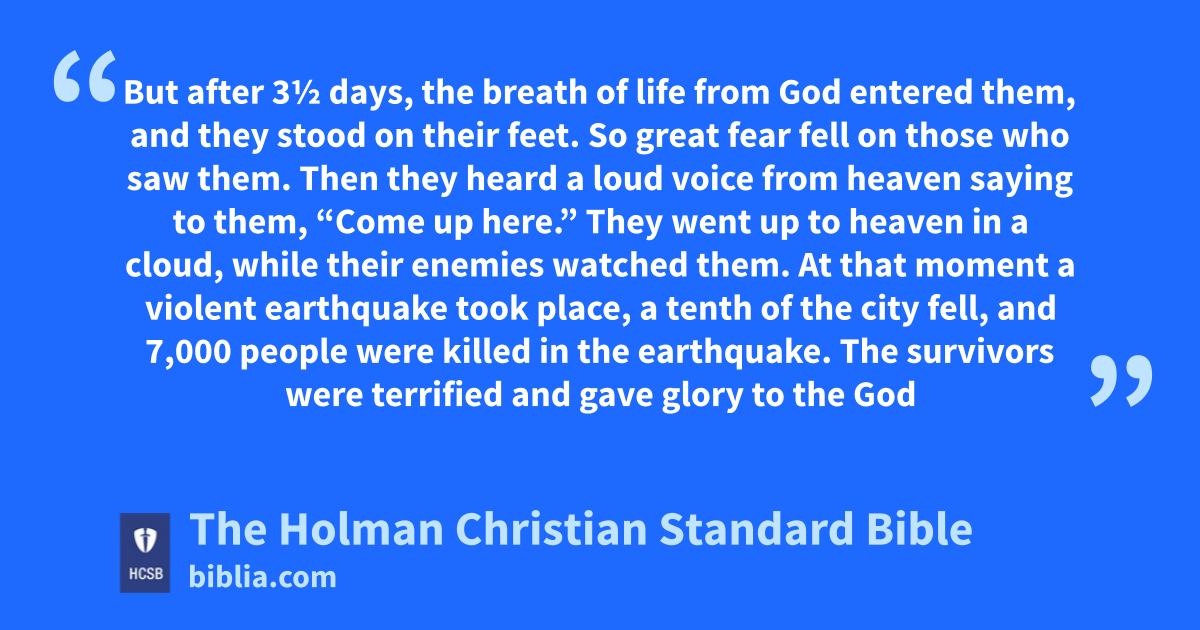 11 But after 3½ days, the breath s of life t from God entered them, and they stood on their feet. So great fear fell on those who saw them. 12 Then they heard u a loud voice from heaven saying to them, “Come up here.” They went up to heaven in a cloud, while their enemies watched them. v 13 At that moment a violent earthquake took place, w a tenth of the city fell, and 7,000 people were killed in the earthquake. The survivors were terrified and gave glory to the God of heaven. 14 The second woe x has passed. Take note: The third woe is coming quickly!