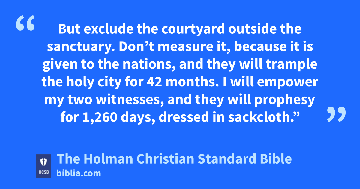 11 Then I was given a measuring reed l like a rod, m with these words: “Go n and measure God’s sanctuary and the altar, and count those who worship there. 2 But exclude the courtyard outside the sanctuary. o Don’t measure it, because it is given to the nations, p q and they will trample the holy city r for 42 months. s 3 I will empower t my two witnesses, and they will prophesy for 1,260 days, u v dressed in * sackcloth.” w x 4 These are the two olive trees and the two lampstands that stand before the Lord y of the earth. z 5 If anyone wants to harm them, fire comes from their mouths and consumes their enemies; a if anyone wants to harm them, he must be killed in this way. 6 These men have the power to close up the sky so that it does not rain during the days of their prophecy. b They also have power over the waters to turn them into blood c and to strike the earth with every plague whenever they want. d