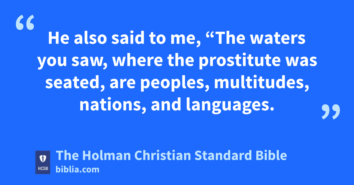 15 He also said to me, “The waters you saw, d where the prostitute was seated, are peoples, multitudes, nations, and languages. e 16 The 10 horns you saw, and the beast, will hate the prostitute. f They will make her desolate and naked, devour her flesh, and burn her up with fire. g 17 For God has put it into their hearts to carry out His plan by having one purpose h and to give their kingdom i to the beast until God’s words are accomplished. j 18 And the woman you saw is the great city that has an empire k over the kings of the earth.”