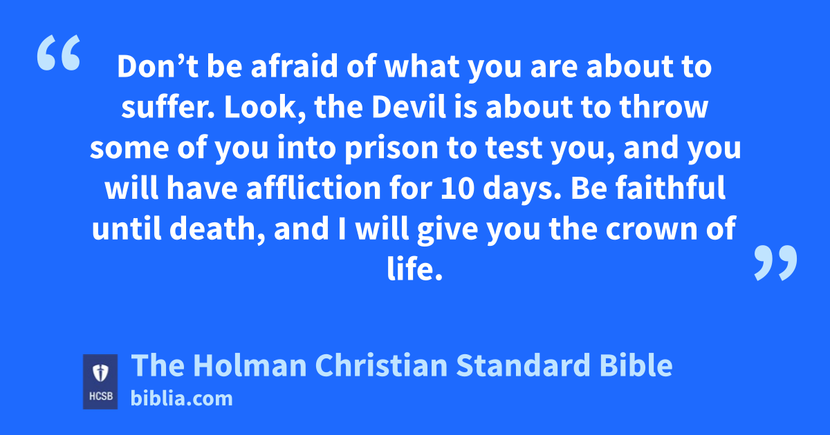 “The First and the Last, g the One who was dead and came to life, says: 9 I know your h affliction and poverty, yet you are rich. I know the slander of those who say they are Jews and are not, but are a * synagogue of Satan. i 10 Don’t be afraid of what you are about to suffer. Look, the Devil j is about to throw some of you into prison to test you, and you will have affliction for 10 days. k Be faithful until death, l and I will give you the crown m of life. n