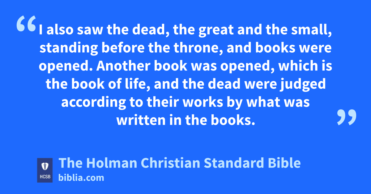 11 Then I saw a great white throne and One seated on it. Earth and heaven fled from His presence, and no place was found for them. h 12 I also saw the dead, the great and the small, standing before the throne, and books were opened. i Another book was opened, which is the book of life, j and the dead were judged according to their works k by what was written in the books.