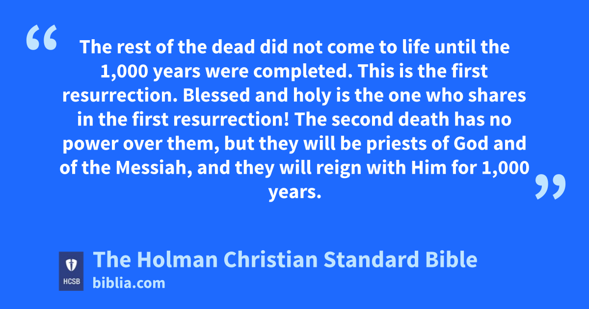 4 Then I saw thrones, and people seated on them who were given authority to judge. m I also saw the people n o who had been beheaded p because of their testimony about Jesus q and because of God’s word, who had not worshiped the beast or his image, and who had not accepted the mark on their foreheads or their hands. r They came to life s and reigned with the * Messiah for 1,000 years. t 5 The rest of the dead did not come to life until the 1,000 years were completed. This is the first resurrection. 6 Blessed u and holy is the one who shares in the first resurrection! The second death v has no power w over them, but they will be priests of God and of the Messiah, and they will reign with Him for 1,000 years. x