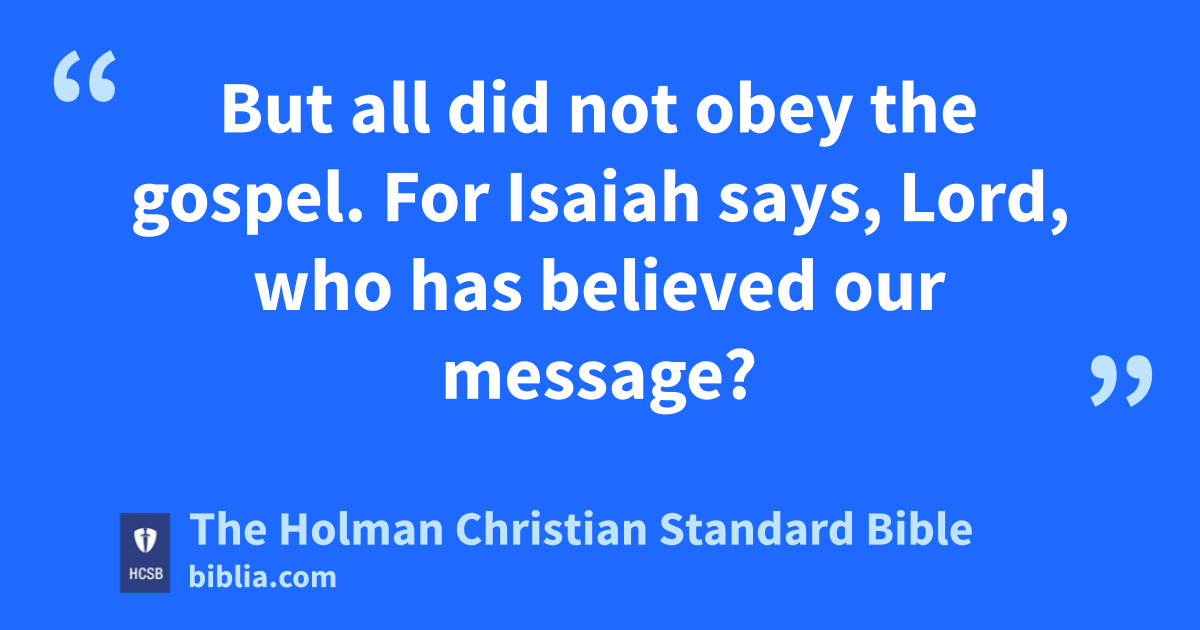 14 But how can they call on Him they have not believed in? And how can they believe without hearing about Him? t And how can they hear without a preacher? u 15 And how can they preach unless they are sent? As it is written: How beautiful v are the feet of those w who announce the gospel of good things! x y 16 But all did not obey the gospel. z For Isaiah says, Lord, who has believed our message? a b 17 So faith comes from what is heard, c and what is heard comes through the message about Christ. d e 18 But I ask, “Did they not hear?” Yes, they did: