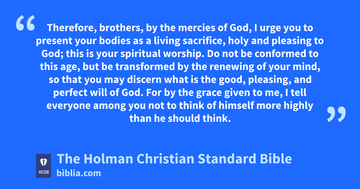 12 Therefore, * brothers, by the mercies of God, I urge you c to present your bodies as a living sacrifice, d holy and pleasing to God; this is your spiritual worship. e 2 Do not be conformed f to this age, g but be transformed by the renewing of your mind, h so that you may discern what is the good, pleasing, and perfect will i of God.