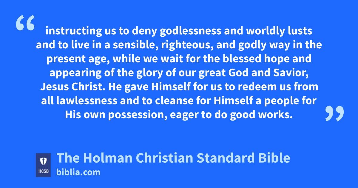 11 For the grace of God has appeared with salvation w for all people, x 12 instructing us to deny godlessness y and worldly lusts z and to live in a sensible, righteous, a and godly b way in the present age, 13 while we wait for the blessed hope c and appearing of the glory d of our great God and Savior, Jesus Christ. 14 He gave Himself for us e to * redeem us from all lawlessness and to cleanse for Himself a people for His own possession, f eager to do good works.