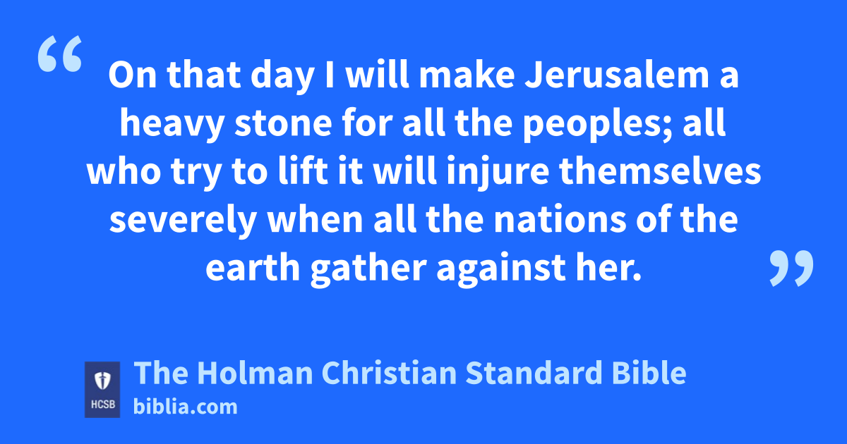 2 “Look, I will make Jerusalem a cup that causes staggering c for the peoples who surround the city. The siege against Jerusalem will also involve Judah. d 3 On that day I will make Jerusalem a heavy stone for all the peoples; all who try to lift it will injure themselves severely when all the nations of the earth gather against her. e 4 On that day”—this is the Lord’s declaration—“I will strike every horse with panic and its rider with madness. f I will keep a watchful eye on g the house of Judah but strike all the horses of the nations with blindness. 5 Then each of the leaders of Judah will think to himself: The residents of Jerusalem are my strength through the Lord of * Hosts, their God. 6 On that day I will make the leaders of Judah like a firepot in a woodpile, h like a flaming torch among sheaves; they will consume all the peoples around them on the right and the left, while Jerusalem continues to be inhabited on its site, in Jerusalem. 7 The Lord will save the tents of Judah first, so that the glory of David’s house and the glory of Jerusalem’s residents may not be greater than that of Judah. 8 On that day the Lord will defend the inhabitants of Jerusalem, i so that on that day the one who is weakest among them will be like David on that day, and the house of David will be like God, like the Angel of the Lord, before them. j 9 On that day I will set out to destroy all the nations that come against Jerusalem.