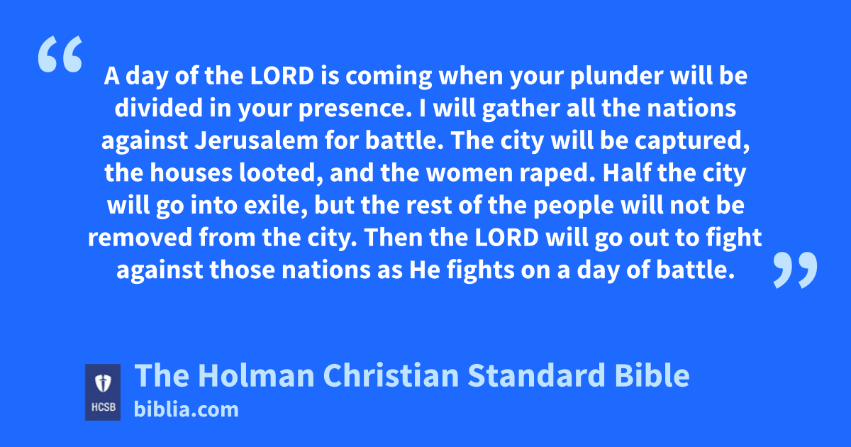 14 A day of the Lord is coming h when your plunder will be divided in your presence. 2 I will gather all the nations against Jerusalem for battle. i The city will be captured, the houses looted, and the women raped. Half the city will go into exile, but the rest of the people will not be removed from the city.