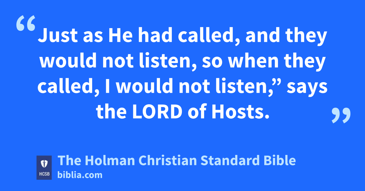 8 The word of the Lord came to Zechariah: 9 “The Lord of Hosts says this: Make fair decisions. n Show faithful love and compassion o to one another. 10 Do not oppress the widow or the fatherless, the foreigner or the poor, p and do not plot evil in your hearts against one another. q 11 But they refused to pay attention r and turned a stubborn shoulder; they closed their ears so they could not hear. s 12 They made their hearts like a rock so as not to obey the law or the words that the Lord of Hosts had sent by His Spirit through the earlier prophets. t Therefore great anger came from the Lord of Hosts. 13 Just as He had called, and they would not listen, so when they called, I would not listen,” says the Lord of Hosts. 14 “I scattered them with a windstorm over all the nations that had not known them, and the land was left desolate behind them, with no one coming or going. They turned a pleasant land into a desolation.”