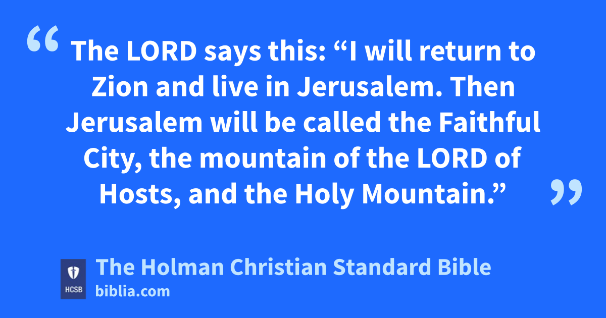8 The word of the Lord of * Hosts came: 2 “The Lord of Hosts says this: I am extremely jealous u for * Zion; I am jealous for her with great wrath.” 3 The Lord says this: “I will return to Zion and live in Jerusalem. Then Jerusalem will be called the Faithful City, v the mountain of the Lord of Hosts, and the Holy Mountain.” 4 The Lord of Hosts says this: “Old men and women will again sit along the streets of Jerusalem, each with a staff in hand because of advanced age. 5 The streets of the city will be filled with boys and girls playing in them.” 6 The Lord of Hosts says this: “Though it may seem incredible to the remnant of this people in those days, should it also seem incredible to Me?”—this is the declaration of the Lord of Hosts. 7 The Lord of Hosts says this: “I will save My people from the land of the east and the land of the west. 8 I will bring them back w to live in Jerusalem. They will be My people, and I will be their faithful and righteous God.” x