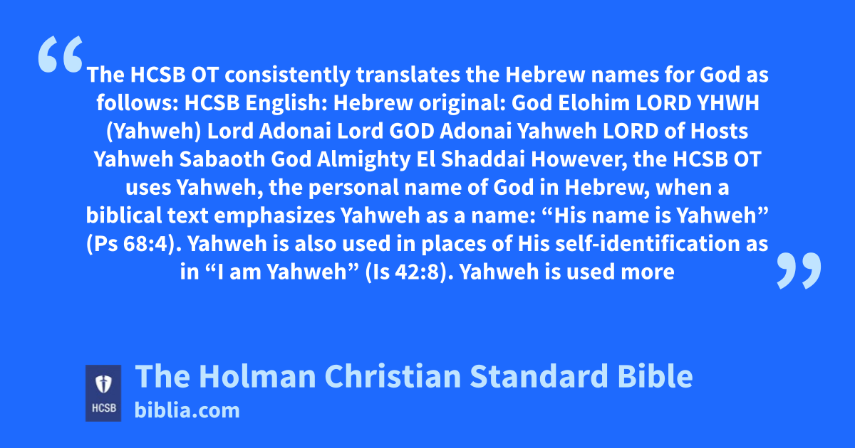 However, the HCSB OT uses Yahweh, the personal name of God in Hebrew, when a biblical text emphasizes Yahweh as a name: “His name is Yahweh” (Ps 68:4). Yahweh is also used in places of His self-identification as in “I am Yahweh” (Is 42:8). Yahweh is used more often in the HCSB than in most Bible translations because the word Lord in English is a title of God and does not accurately convey to modern readers the emphasis on God’s personal name in the original Hebrew.