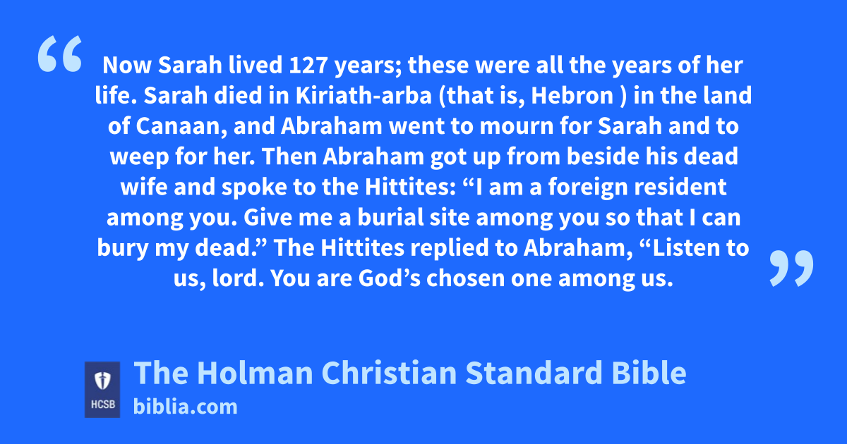 5 The Hittites replied to Abraham, x 6 “Listen to us, lord. y You are God’s chosen one z among us. Bury your dead in our finest burial place. a None of us will withhold from you his burial place for burying your dead.”