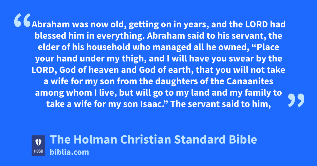 24 Abraham was now old, getting on in years, k l and the Lord had blessed him in everything. 2 Abraham said to his servant, the elder of his household who managed all he owned, “Place your hand under my thigh, m 3 and I will have you swear by the Lord, God of heaven and God of earth, that you will not take a wife for my son from the daughters of the Canaanites among whom I live, n 4 but will go to my land and my family to take a wife for my son Isaac.”