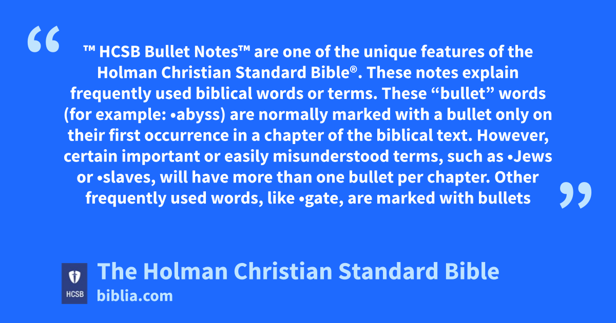 HCSB Bullet Notes™ are one of the unique features of the Holman Christian Standard Bible®. These notes explain frequently used biblical words or terms. These “bullet” words (for example: •abyss) are normally marked with a bullet only on their first occurrence in a chapter of the biblical text. However, certain important or easily misunderstood terms, such as •Jews or •slaves, will have more than one bullet per chapter. Other frequently used words, like •gate, are marked with bullets only where the use of the word fits the definitions given below. A few words in footnotes, like •acrostic, also have a bullet.