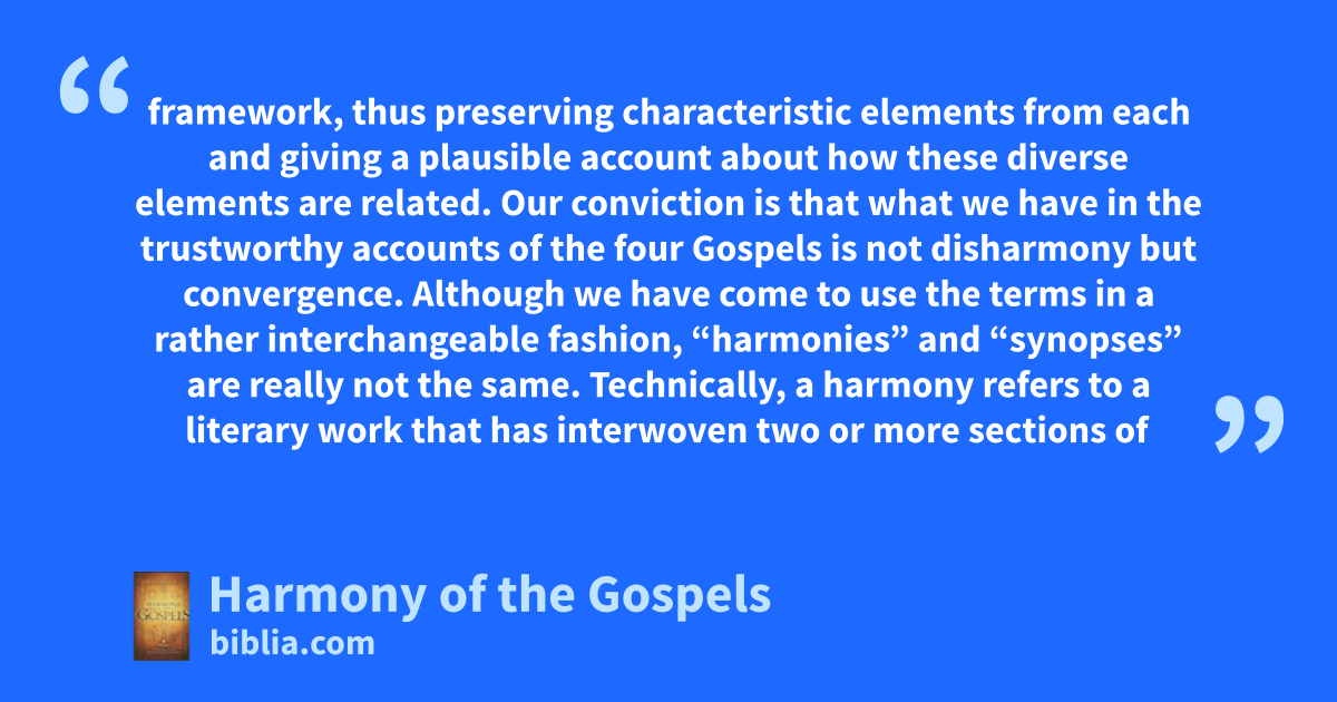 framework, thus preserving characteristic elements from each and giving a plausible account about how these diverse elements are related. Our conviction is that what we have in the trustworthy accounts of the four Gospels is not disharmony but convergence. Although we have come to use the terms in a rather interchangeable fashion, “harmonies” and “synopses” are really not the same. Technically, a harmony refers to a literary work that has interwoven two or more sections of
