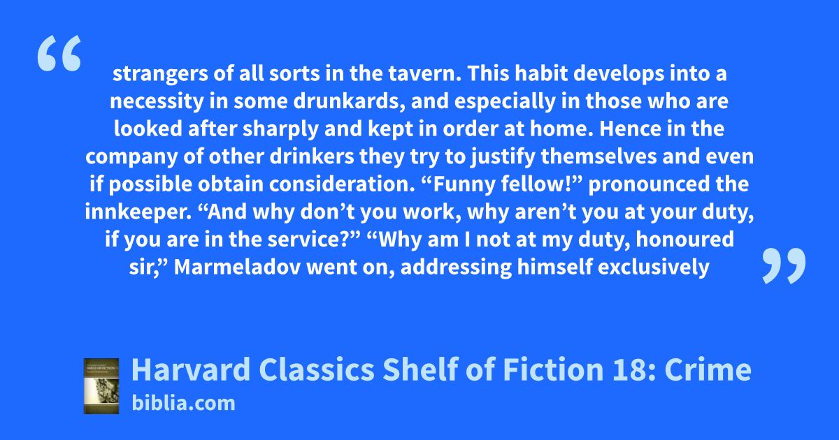 strangers of all sorts in the tavern. This habit develops into a necessity in some drunkards, and especially in those who are looked after sharply and kept in order at home. Hence in the company of other drinkers they try to justify themselves and even if possible obtain consideration. “Funny fellow!” pronounced the innkeeper. “And why don’t you work, why aren’t you at your duty, if you are in the service?” “Why am I not at my duty, honoured sir,” Marmeladov went on, addressing himself exclusively