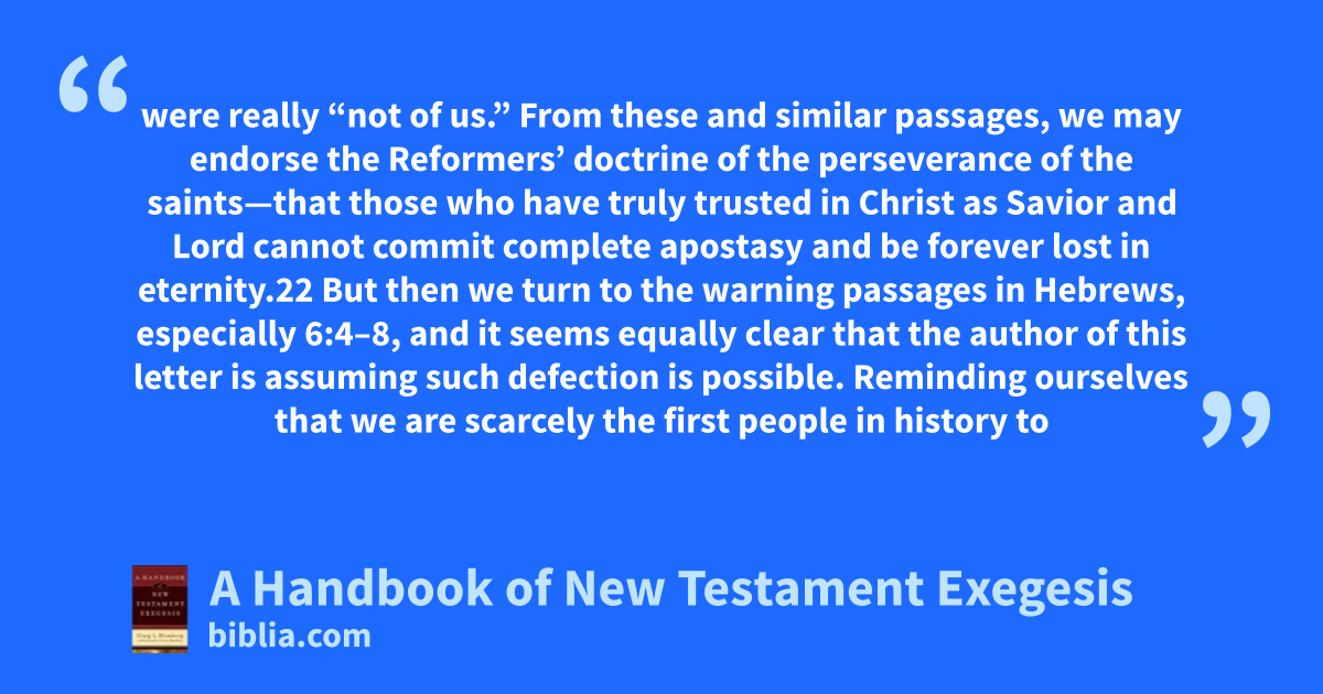 were really “not of us.” From these and similar passages, we may endorse the Reformers’ doctrine of the perseverance of the saints—that those who have truly trusted in Christ as Savior and Lord cannot commit complete apostasy and be forever lost in eternity.22 But then we turn to the warning passages in Hebrews, especially 6:4–8, and it seems equally clear that the author of this letter is assuming such defection is possible. Reminding ourselves that we are scarcely the first people in history to