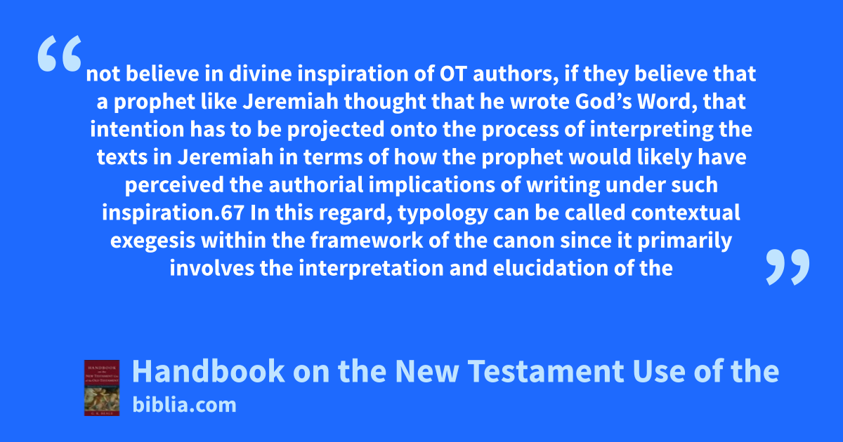 not believe in divine inspiration of OT authors, if they believe that a prophet like Jeremiah thought that he wrote God’s Word, that intention has to be projected onto the process of interpreting the texts in Jeremiah in terms of how the prophet would likely have perceived the authorial implications of writing under such inspiration.67 In this regard, typology can be called contextual exegesis within the framework of the canon since it primarily involves the interpretation and elucidation of the