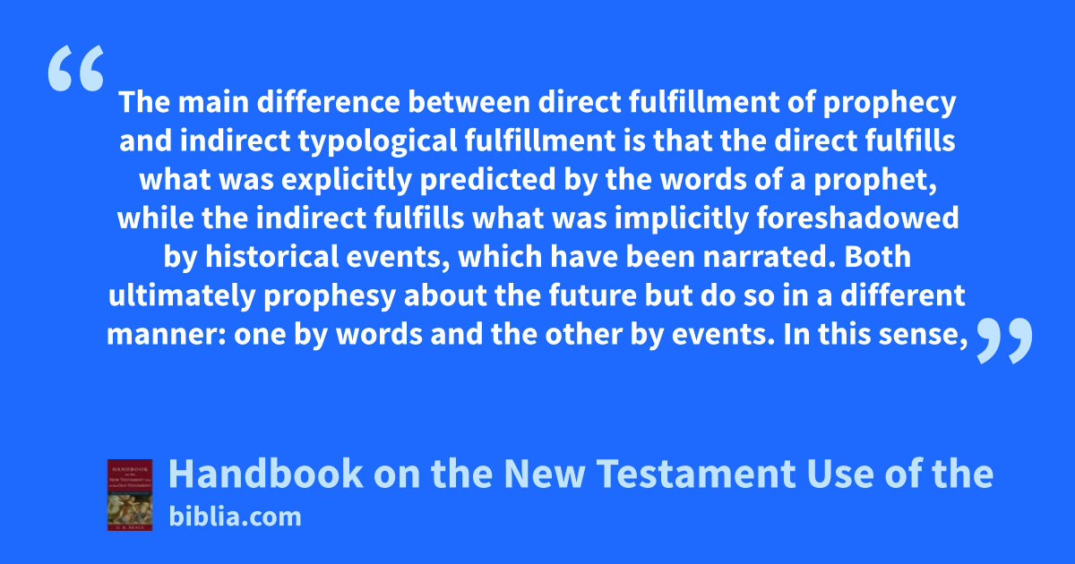 The main difference between direct fulfillment of prophecy and indirect typological fulfillment is that the direct fulfills what was explicitly predicted by the words of a prophet, while the indirect fulfills what was implicitly foreshadowed by historical events, which have been narrated. Both ultimately prophesy about the future but do so in a different manner: one by words and the other by events. In this sense,